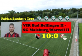 Die Zweite legte los wie die Feuerwehr. Nach neun Minuten stand es bereits 3:0 für den VfR. Goalgetter Fabian Bunke schoss die Heine-Elf in der 3. und 7. Minute mit 2:0 in Führung bevor Danilo Kuhl einen Elfmeter zum 3:0 (9. Min.) versenkte. Die Zuschauer mussten dann allerdings bis zur 41. Minute warten bis ein weiteres Tor fiel. Fabian Bunke sorgte dafür und erzielte sein drittes Tor in diesem Spiel. Nach der Pause gleich ein Doppelschlag von Danilo Kuhl (46. Min.) zum 5:0 und Thomas Roßkopf (49. Min.) zum 6:0. Das 7:0 (67. Min.) war wieder eine Angelegenheit von Fabian Bunke, bevor der eingewechselte „Johnny“ Epking dem Malsburg/Marzeller Torhüter mit einem Elfmeter zum 8:0 in der 74. Minute keine Chance ließ. Auch Artur Weiz trug sich in der 84. Minute mit dem 9:0 in die Torschützenliste ein. Den Endpunkt mit dem 10:0 setzt Fabian Bunke der in diesem Spiel fünf Tore schoss und die Führung der Torschützenliste der Kreisliga C Staffel 1 übernahm.