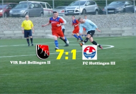 In der Woche vor dem Spiel löste Benny Fräulin Barthel Heine als Trainer der 2. Mannschaft des VfR Bad Bellingen ab und startet mit einem Heimsieg gegen die 3. Mannschaft des FC Huttingen in seine Trainertätigkeit. Der VfR ging bereits in der 6. Minute durch Fabian Bunke nach schöner Vorlage von Ahmed Hasnaoui in Führung. Durch einen Fehlpass im Abwehrbereich (14.) gelang den Gästen der Ausgleich. Im weiteren Verlauf der ersten Hälfte war der VfR tonangebend mit hohen Spielanteilen, konnte diese Überlegenheit aber nicht in weitere Tore ummünzen. Den Torreigen eröffnete Ahmed Hasnaoui (51.) in der zweite Halbzeit zum 2:1. Nico Bunke entwickelte sich an diesem Abend zum Flankengott und zirkelte Thomas Roßkopf zwei Eckbälle in den Strafraum, die „Rossi“ mit zwei Kopfballtorpedos (56., 70.) zum 3:1 und 4:1 verwandelte. Der Bann war nun gebrochen und die weiteren Tore erzielten Benny Fräulin (82.), Jannik Hugenschmidt (84.) und nochmals „Rossi“ der mit dem 7:1 seinen Dreierpack vollmachte.