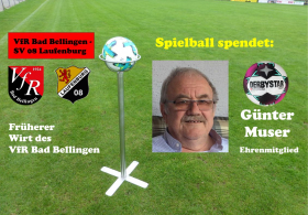 Die Spende des Spielballs für das Heimspiel gegen den SV 08 Laufenburg kommt von Ehrenmitglied Günter Muser aus Hertingen. Günter war zusammen mit seiner Elsbeth von 1980 – 1992 Pächter der Sportgaststätte des VfR Bad Bellingen. Die etwas älteren Kicker denken gerne an unzählige schöne Stunden in dieser Zeit im Kickerhisle zurück. Die VfR-Fans hoffen, dass der Spenderball einen Sieg einbringt und die drei Punkte gefeiert werden können. Herzlichen Dank für die Ballspende.